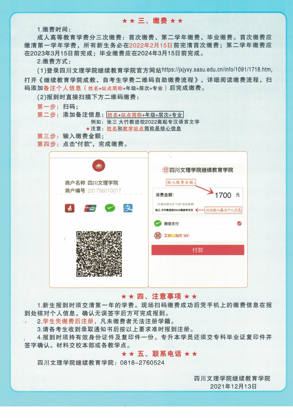 温馨提示:各位同学缴费时请务必备注相关信息,按照规定的缴费时间和缴费方式缴费。如缴费时出现任何问题,请将相关诉求简要描述并
