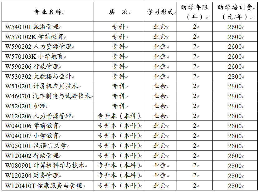 【招生专业、助学培训费一览表】