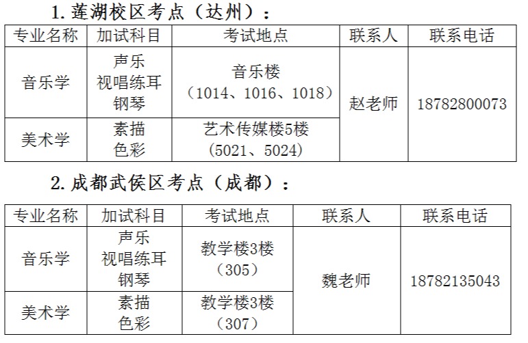 按照《教育部办公厅关于做好 2020年全国成人高校考试招生工 作的通知》(教学厅〔2020〕11 号)及有关规定,并结合《四川省2020年成人高校招生实施规定》,“报考艺术类专业的考生必须按照招生公司规定的时间和地点参加由招生公司组织的专业课加试”的要求,拟订于2020年10月31日(星期六)、11月1日(星期日)在K1体育官方网站莲湖校区、成都武侯区考点进行艺术类专业加试。现将相关事宜通知如下: