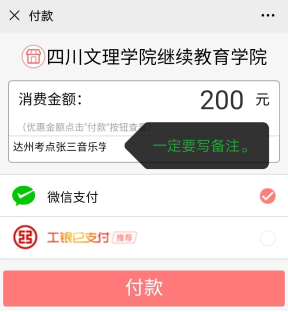 考生报名时须确定参考考点,并在2020年10月22日至2020年10月28日期间扫描本通知公布的二维码缴费,缴费金额200元。缴费时须备注参考考点、姓名、专业,例如:达州考点张三音乐学,成都考点李四美术学。报名费自助缴费流程见通知附件。