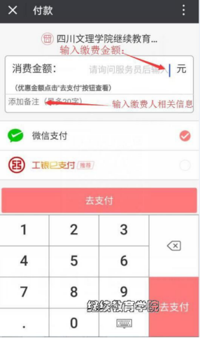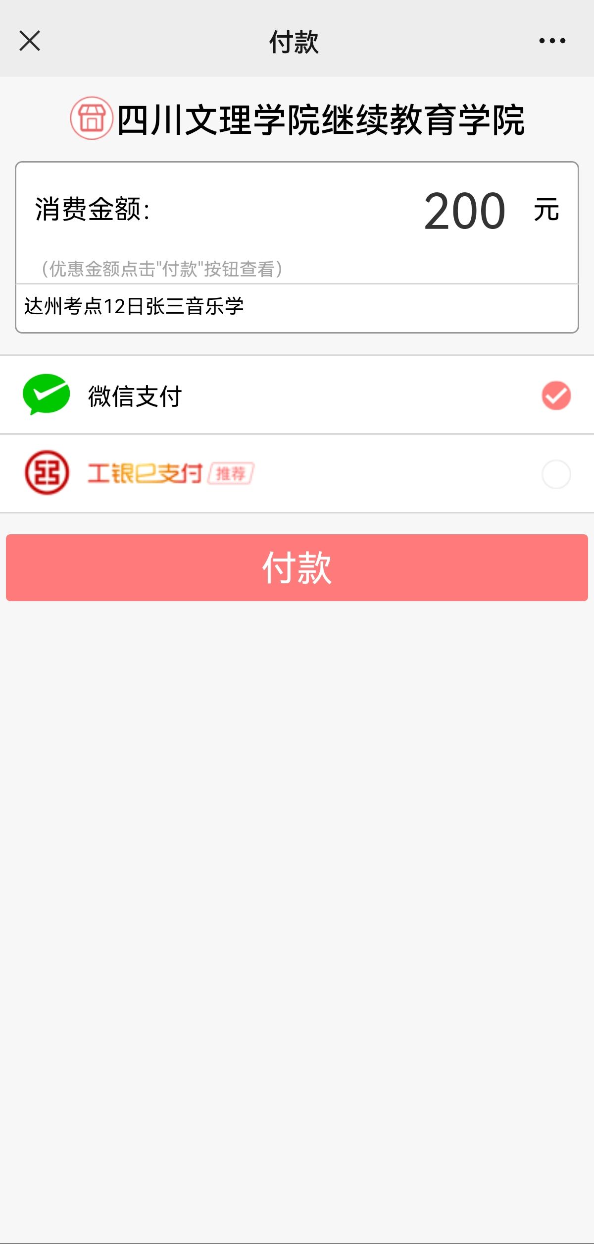 4. 点“付款”完成支付。(缴费联系电话:曾老师0818-2760524)