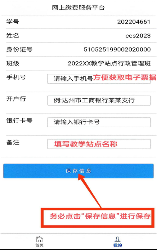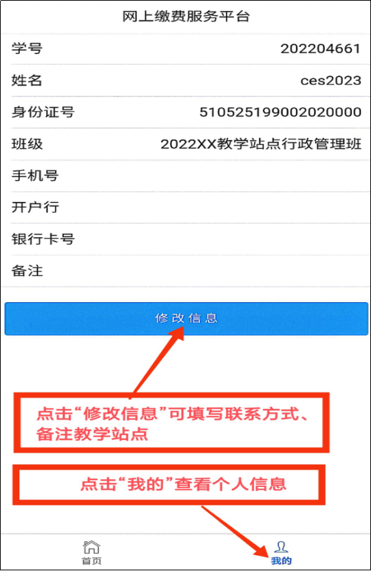 成教、自考老生确认信息无误后,可点击首页查看缴费信息。成教新生务必点击“修改信息”,在备注栏写明教学站点简称并保存,方可进行缴费。