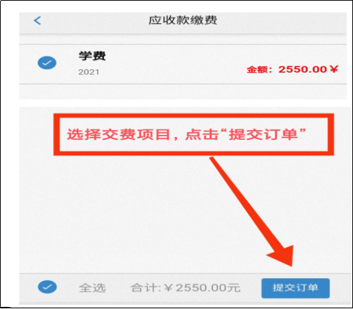第二步,选择缴费项目,点击“提交订单”: